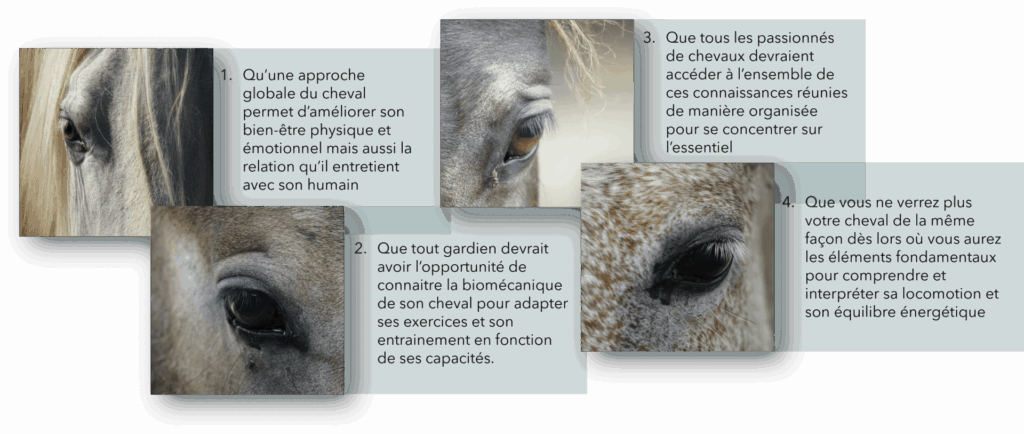 Créer une relation harmonieuse, complice et comprise avec son cheval est un travail de tous les instants qui se construit dans le temps. Il ne suffit pas de connaitre tous les codes de la communication éthologique ni toutes les ficelles de la haute école de dressage pour que votre cheval devienne le compagnon idéal capable de réaliser tous vos souhaits. Le cheval est un être vivant doté d’une personnalité, qui a des émotions, une génétique qui lui est propre, une conformation, des envies, des besoins, dont l’environnement, la nourriture, les hormones, la morphologie, les carences, le stress, l’entrainement,…vont avoir un impact sur son bien-être qu’il soit physique ou psychique ou psychologique et donc avoir des conséquences sur sa locomotion, ses aplombs, ses humeurs, sa santé,…