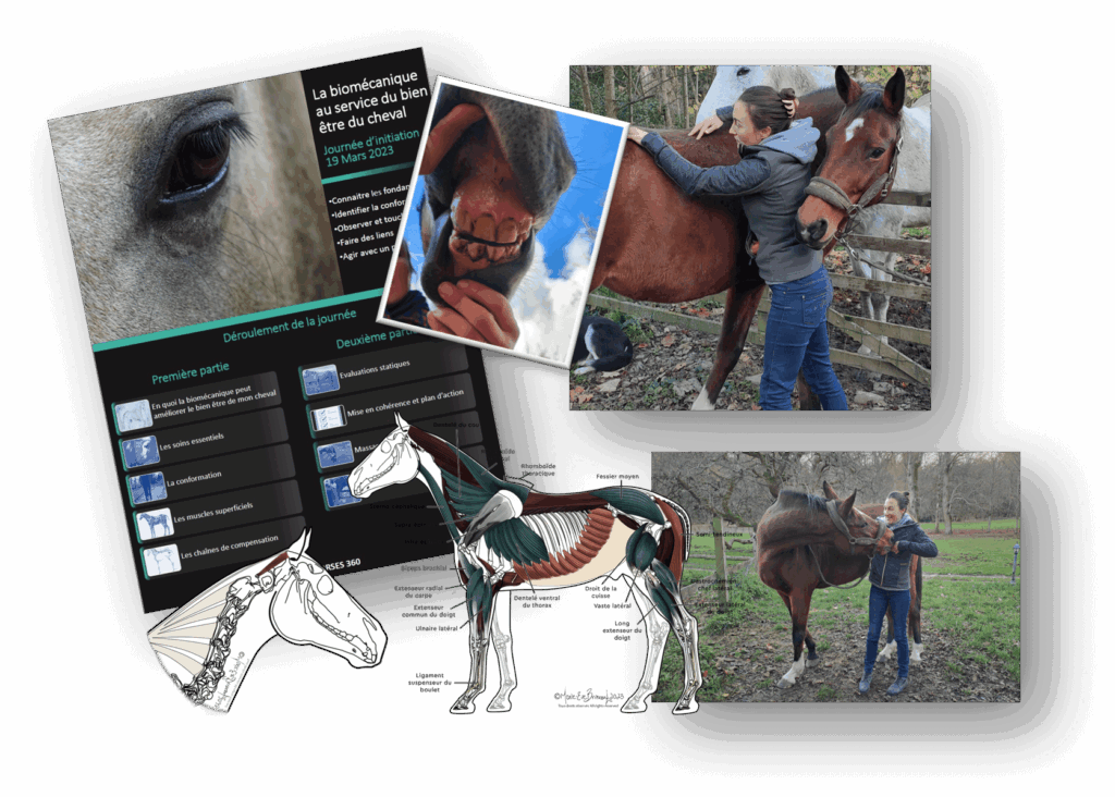 Je propose des formations pour vous aider à observer et comprendre la locomotion et la physiologie des chevaux. L’objectif est de pouvoir vous donner les clés de lecture de la biomécanique mais aussi anatomique, musculaire ainsi que les besoins fondamentaux du cheval afin que vous puissiez de vous-même l’appliquer au votre. Vous pourrez ainsi identifier ses défauts d’aplombs, ses points forts et ses faiblesses, ses tensions musculaires et ses asymétries. Vous serez capables de mettre en place un plan d’action concret avec des axes d’amélioration et un plan d’entrainement personnalisé et adapté à votre cheval.